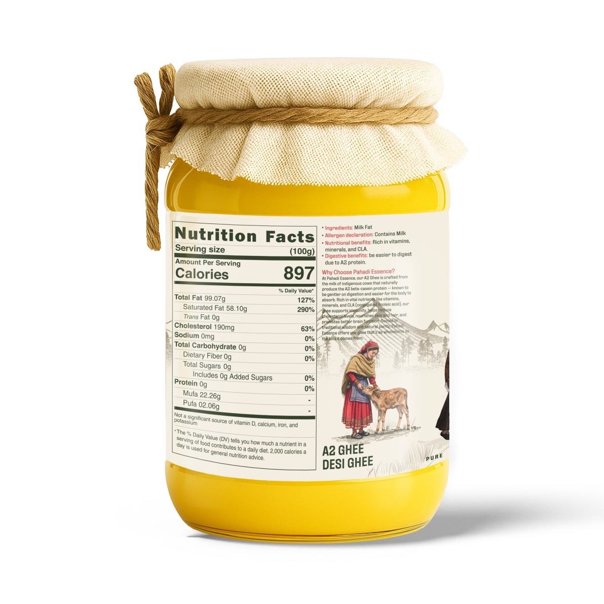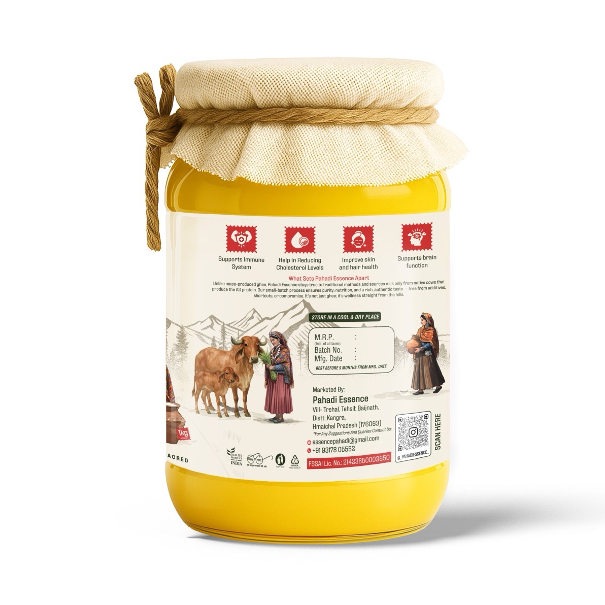 Our A2 ghee is made from milk of indigenous Pahadi cows grazing on wild herbal grasses. Using the ancient Bilona method, local Pahadi women hand-churn each batch with care, preserving nutrients, flavor, and Ayurveda’s healing qualities. Pahadi Essence is more than ghee—it’s a women-driven tradition empowering communities.
